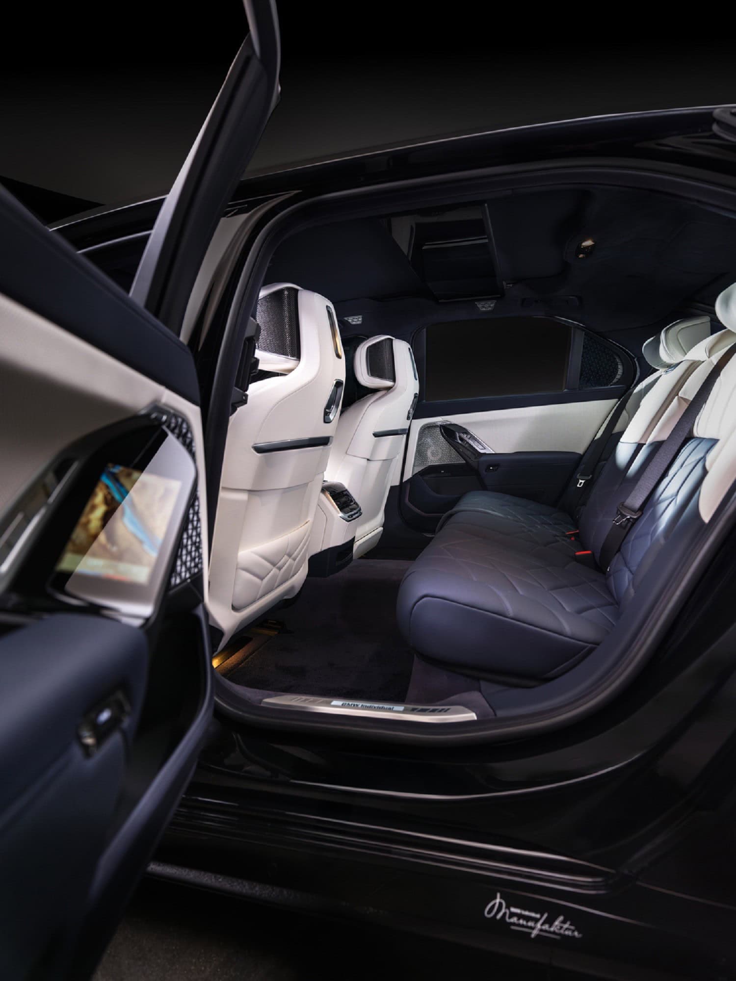 As for the 7 Series, it’s offered as either a 740i or a 750e. Both feature a deeper black exterior finish enhanced by the Shadowline treatment and 21-inch Individual wheels. Here, the Individual Manufaktur logo moves to a new location, adorning the Hofmeister kink and repeating on the side skirts.