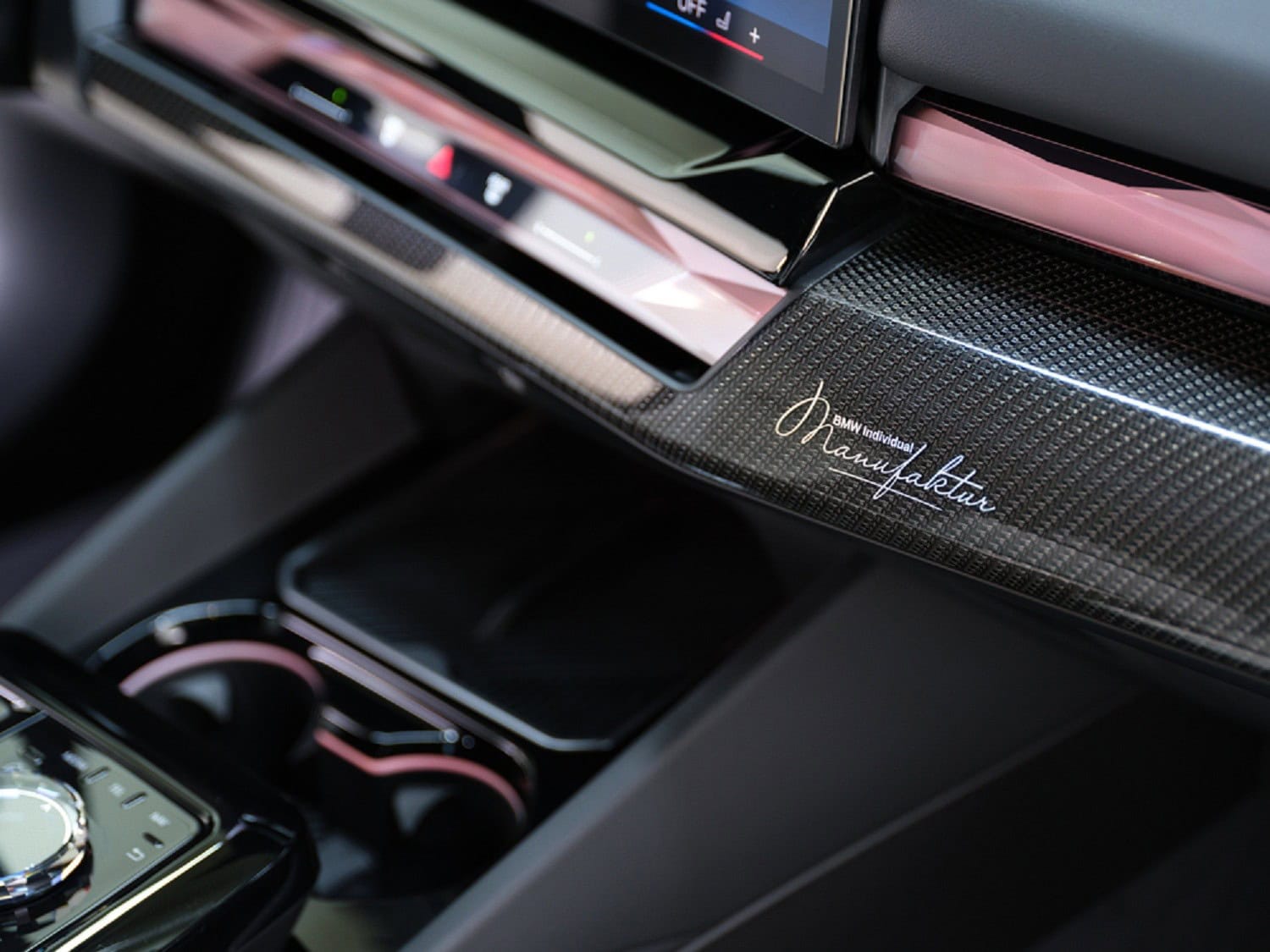 The similarities continue inside, where the plug-in hybrid 5 Series features white leather complemented by an anthracite Alcantara headliner and carbon fiber trim. Once again, the Individual Manufaktur logo appears on the front headrests.