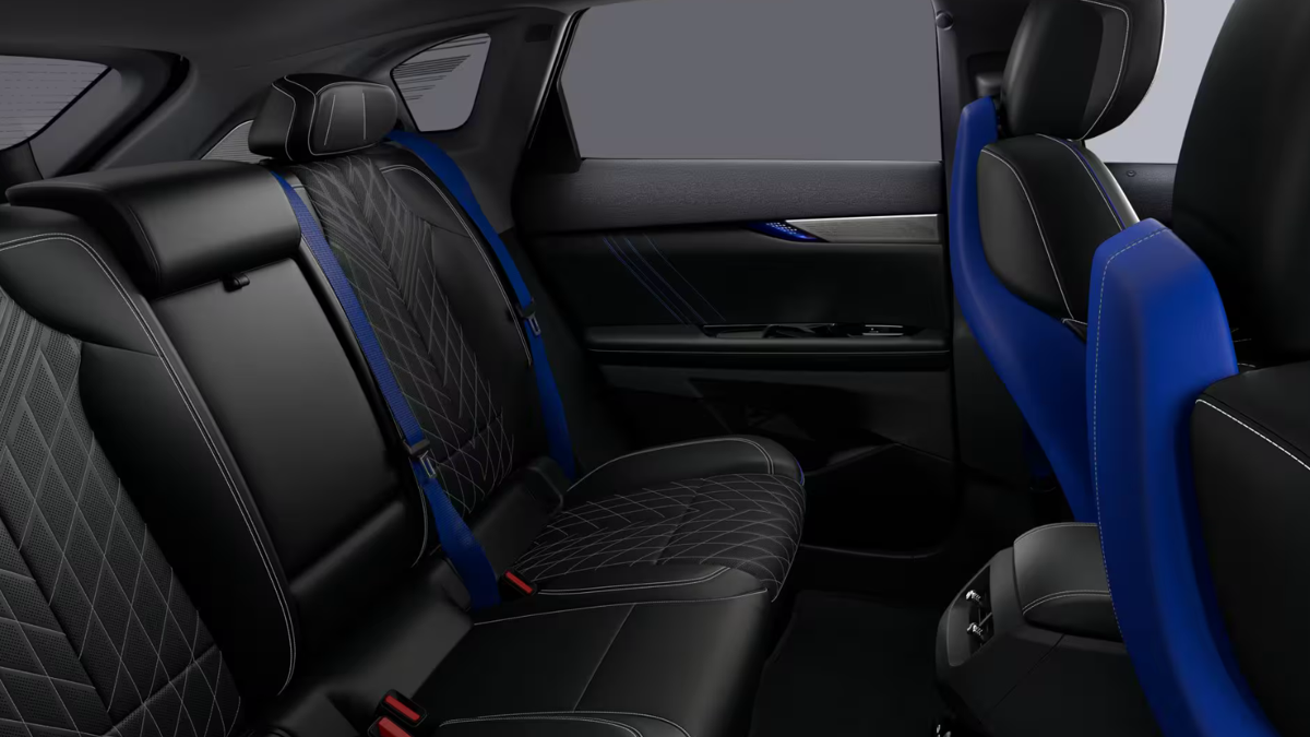 The blue motif continues inside with the Santorini Blue interior package set against a Noir (black) cabin.