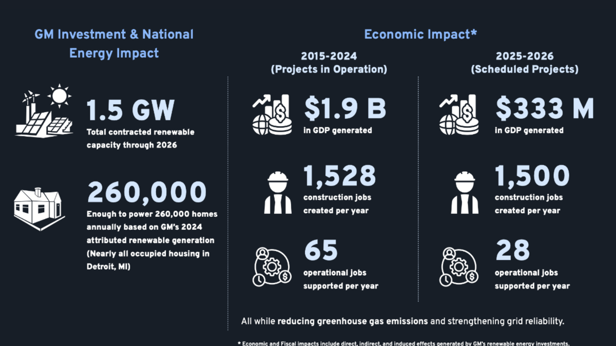 As a result, GM has reduced operational emissions by 52% since 2018. It has also contracted 1.5 GW of renewable energy capacity through 2026, enough to power 260,000 homes annually. In terms of economic impact, the company’s renewable energy investments generated $1.9 billion in GDP, created 1,528 construction jobs per year, and supported 65 operational jobs per year from 2015 to 2024.