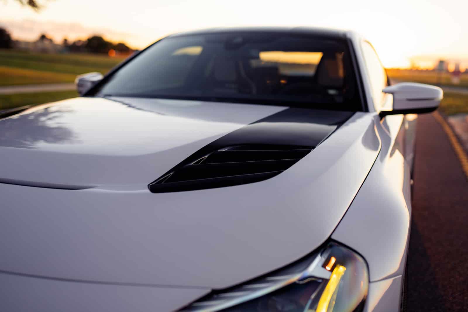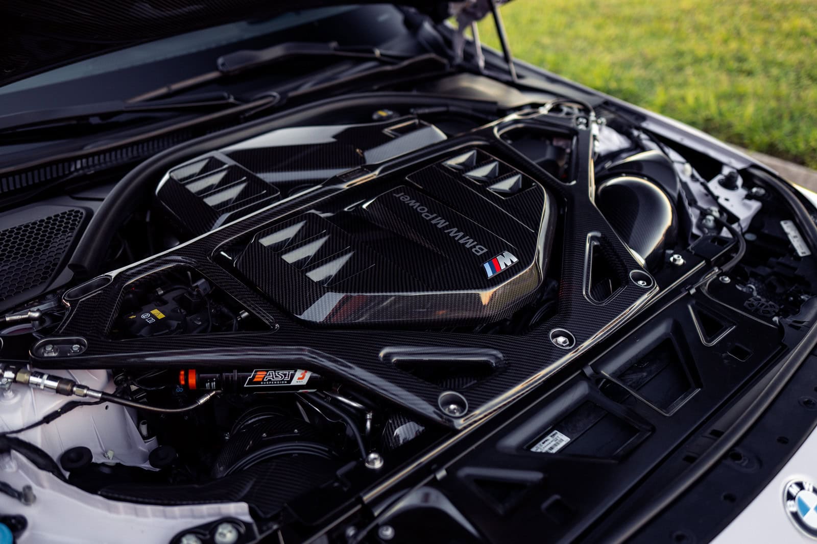 Open the hood and the theme continues. The plastic factory engine bay has been replaced with Eventuri’s full carbon system: intake, engine cover, and the new CSL-style carbon strut brace.
