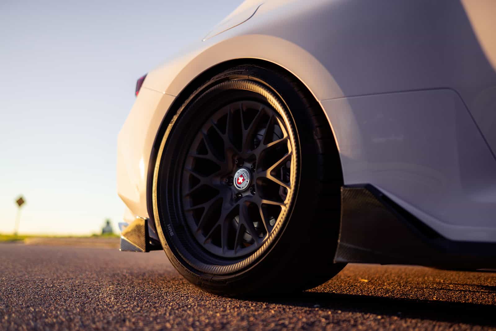 The entire exterior now wears Vorsteiner’s G87 carbon kit, an aggressive package that includes a vented hood, widened carbon fenders, sculpted side skirts, a deep front lip, a carbon trunk with a molded ducktail, and one of the wildest diffusers fitted to any current BMW. To tie the kit together, Precision Sport Industries added M Performance carbon air ducts and a set of carbon-barreled HRE 520 CRBN wheels.