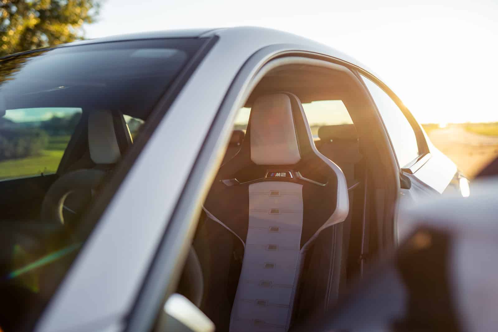 The original M2 came with standard comfort seats. But the customer wanted more. A set of OEM carbon buckets was sourced and shipped to BMW Restored Seats in Connecticut, along with every major interior panel. Everything—seats, inserts, bolsters, door cards—was reupholstered in Moon Gem leather, gray Alcantara, and matching Moon Gem stitching.