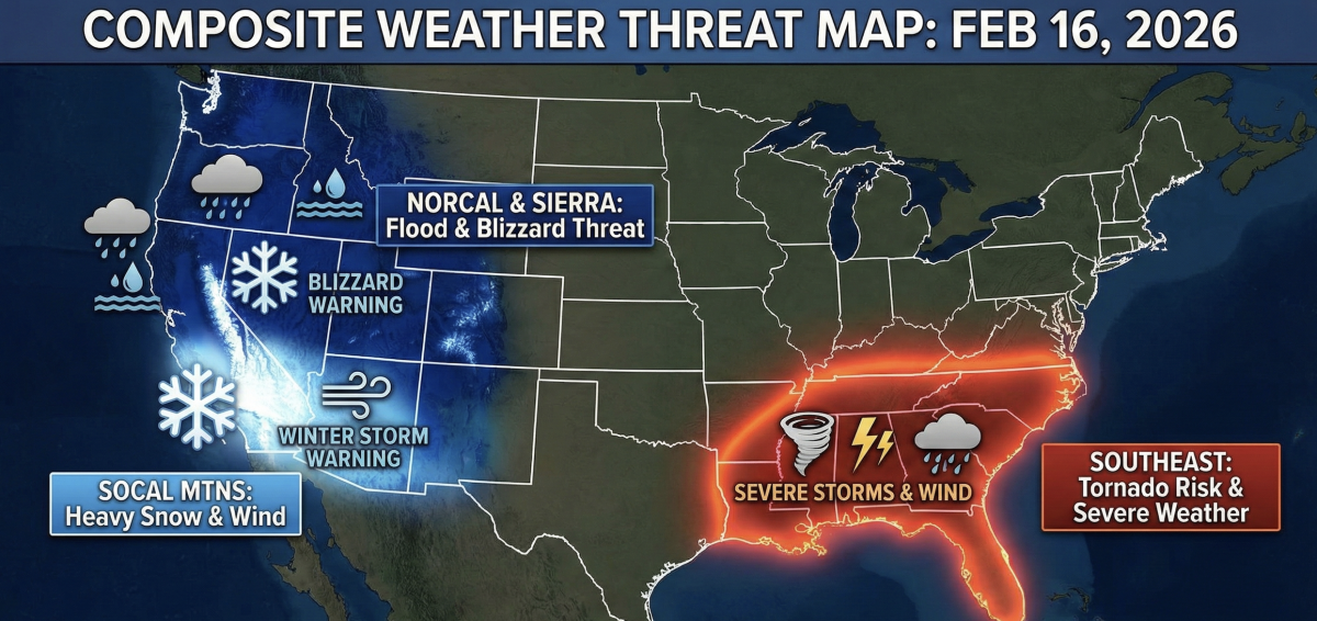 It is Presidents’ Day, traditionally a busy travel holiday, but Mother Nature has other plans for a vast swath of the United States today, February 16, 2026. Major weather systems are causing havoc on both coasts and in the deep South, turning highways into hazard zones and grounding flights.